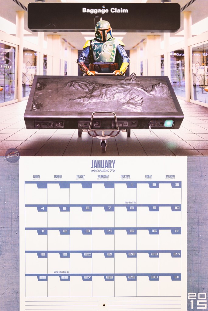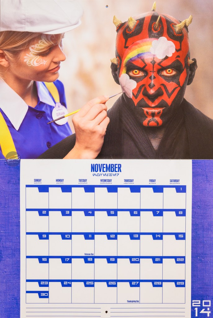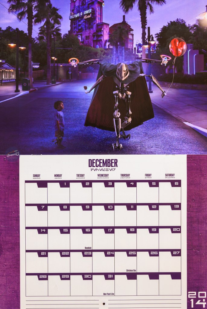 With all the Galaxy’s Edge news coming out of Disneyland, I thought it would be a good time to share a little Star Wars goodness. This is the 2014/2015 calendar that was sold during Star Wars Weekends in 2014, which would end up being the second to last SWW. The photos are cute; Star Wars characters interacting at WDW and in Orlando. It was a time when Disney was gearing up for the onslaught of Star Wars movies and shows, with SW Rebels about to be released later in 2014, and “The Force Awakens” still over a year away. Now, we’re about six months away from “The Rise of Skywalker” and the end of the Skywalker saga. Fingers crossed that the series is wrapped up properly.