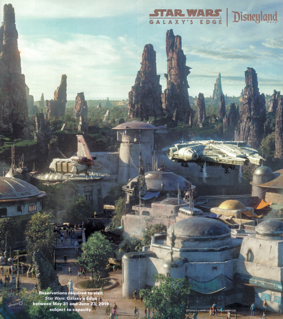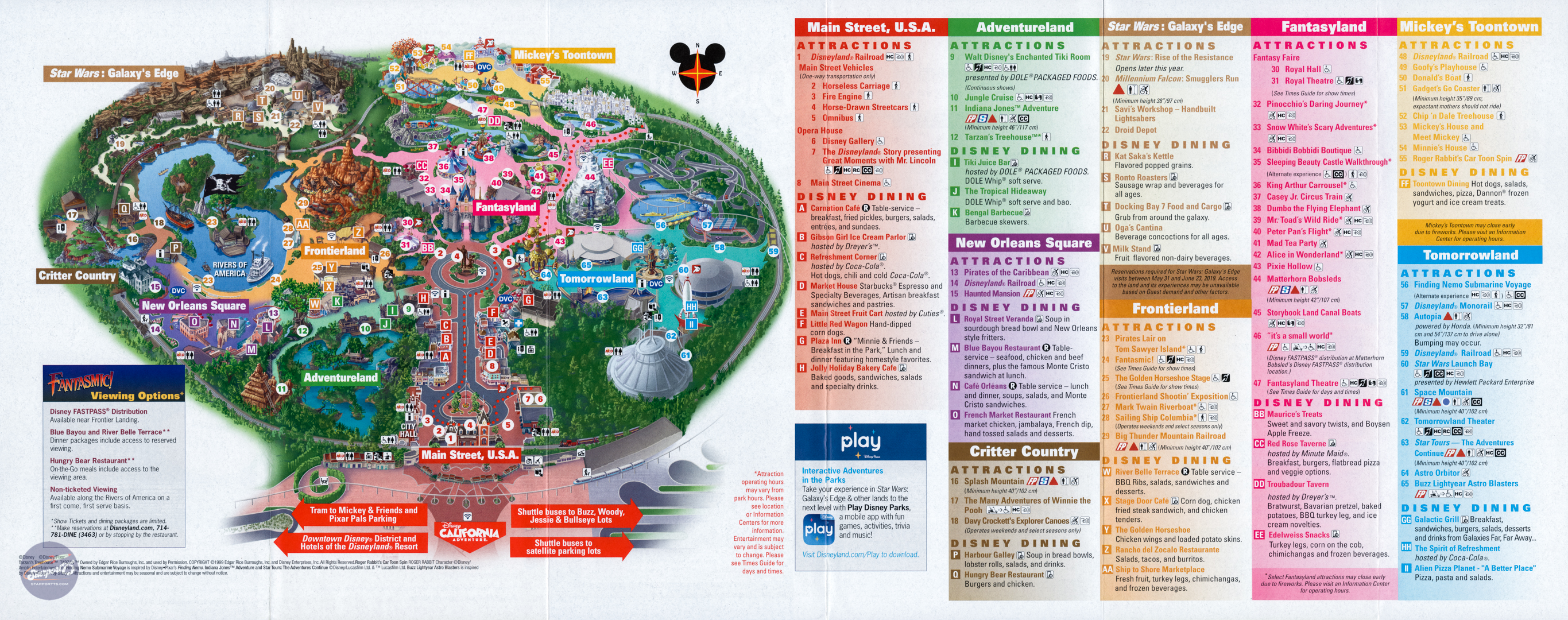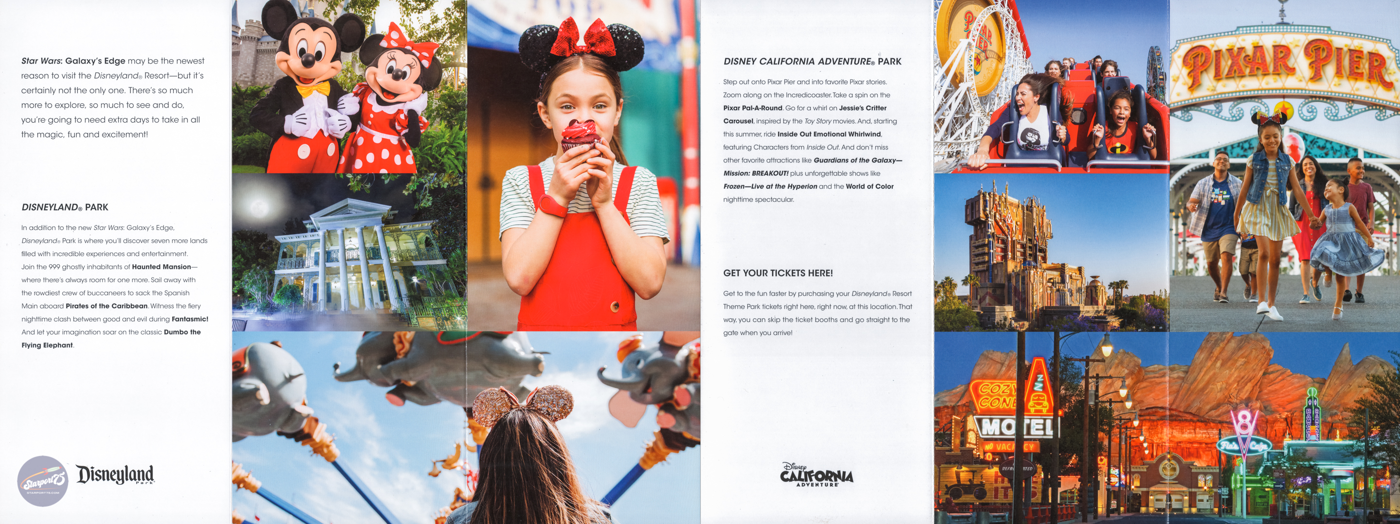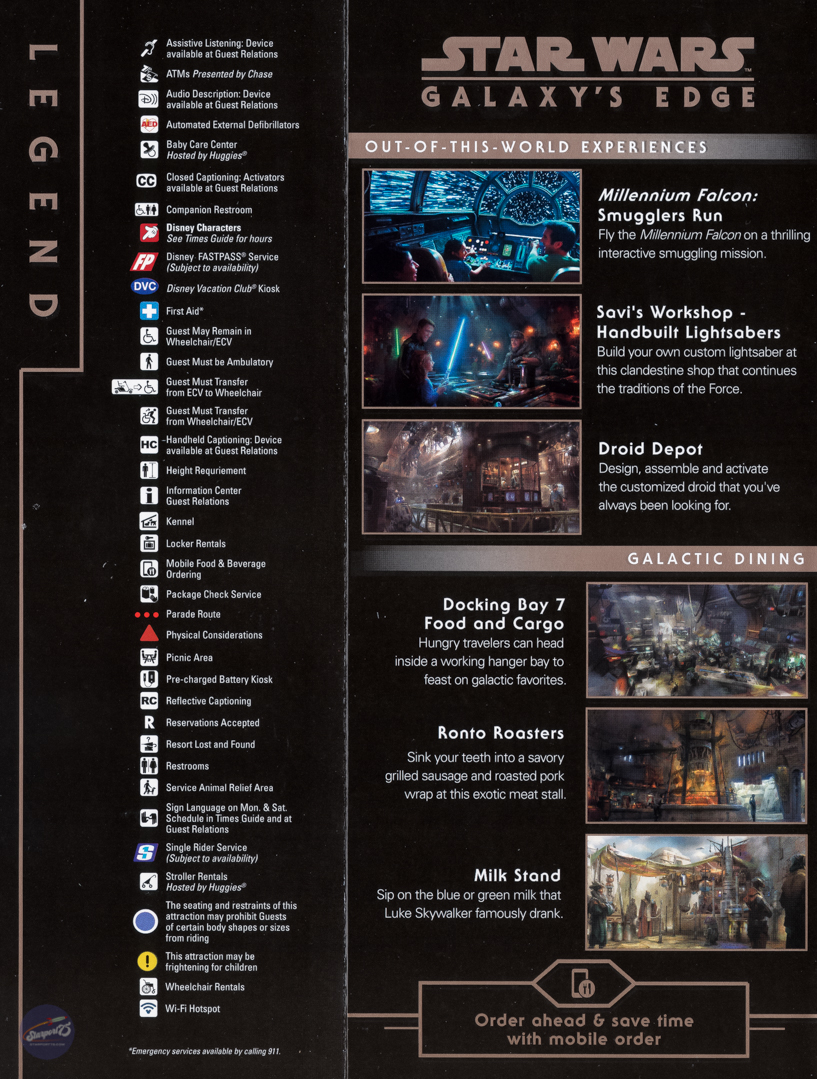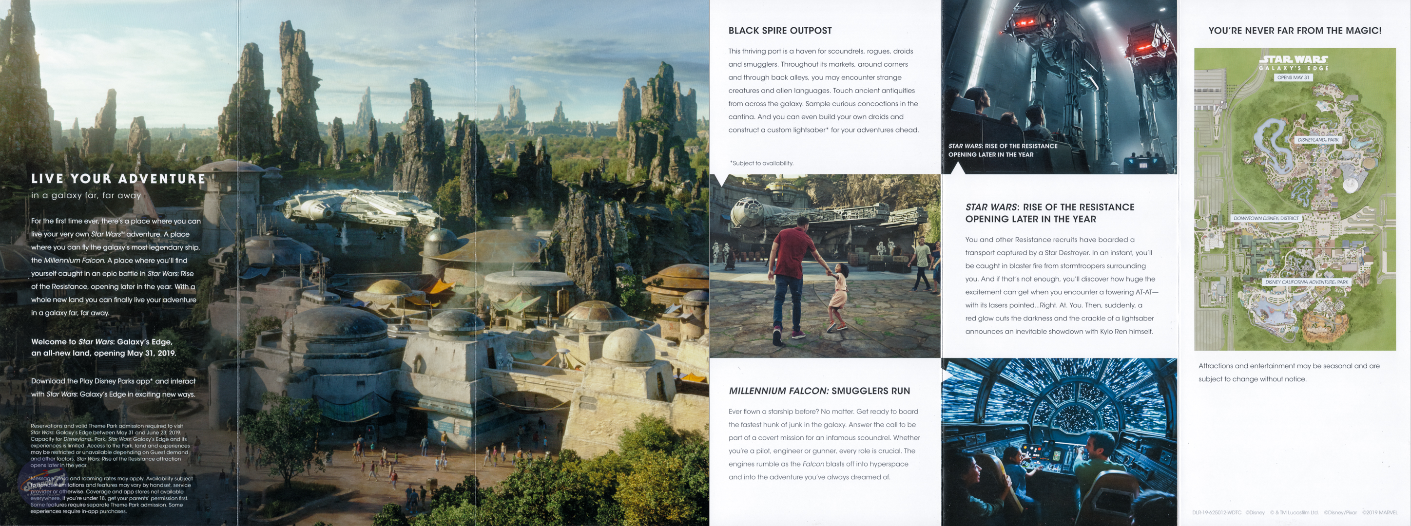 Anyway, below is the Galaxy’s Edge Guidemap, which in it’s physical form, is beautiful: it’s on a cardstock (not regular paper), and is glossy and matte in different places. The scans certainly don’t do it justice. Also below is the regular Disneyland Guidemap for the whole park. And, finally, a promotional brochure for Galaxy’s Edge.