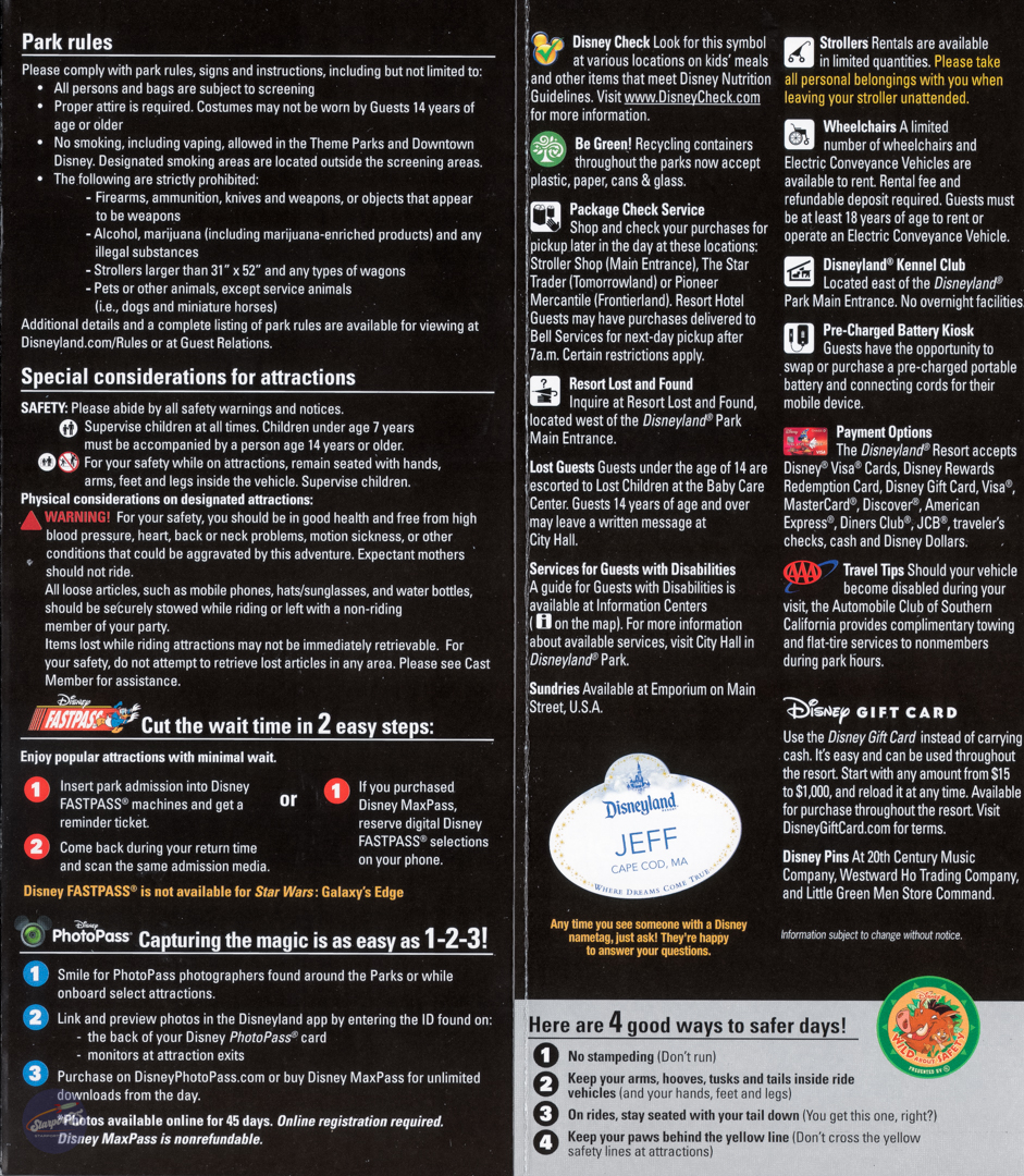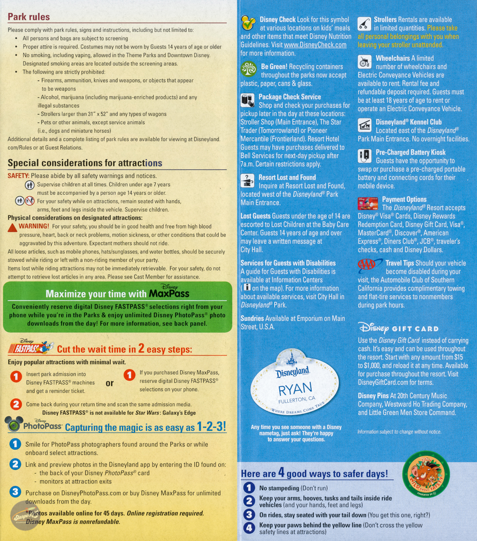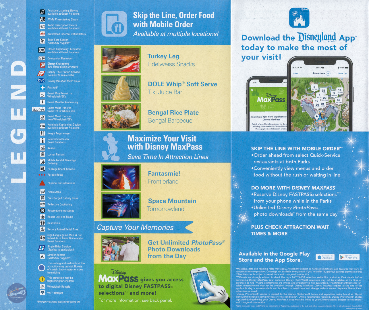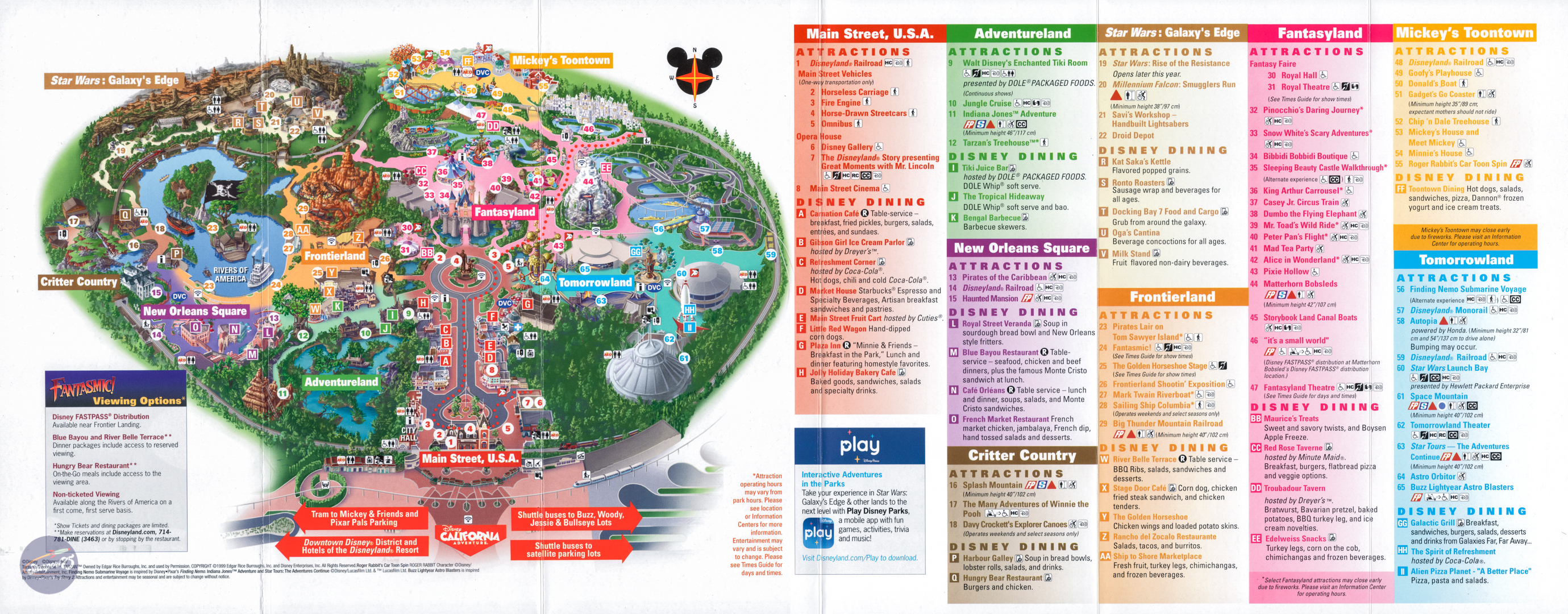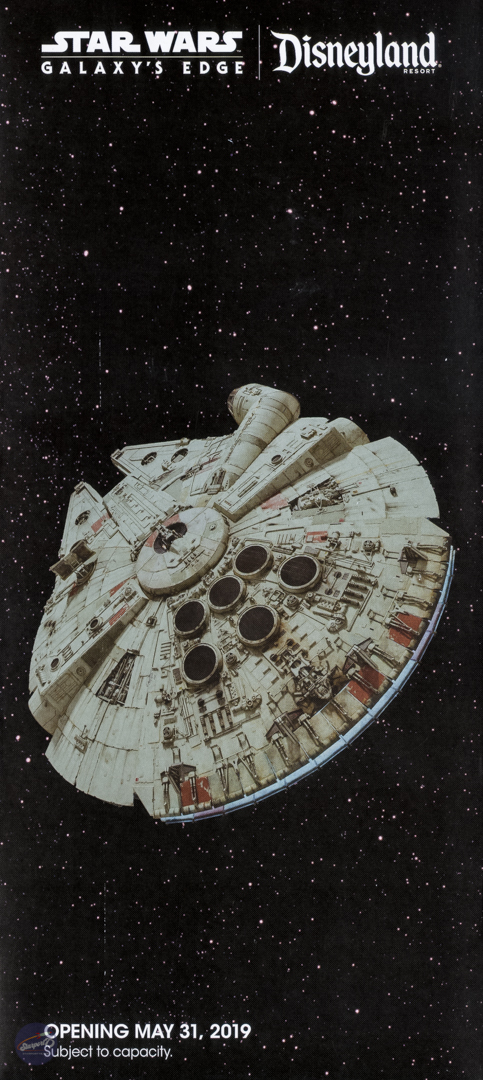 Anyway, below is the Galaxy’s Edge Guidemap, which in it’s physical form, is beautiful: it’s on a cardstock (not regular paper), and is glossy and matte in different places. The scans certainly don’t do it justice. Also below is the regular Disneyland Guidemap for the whole park. And, finally, a promotional brochure for Galaxy’s Edge.