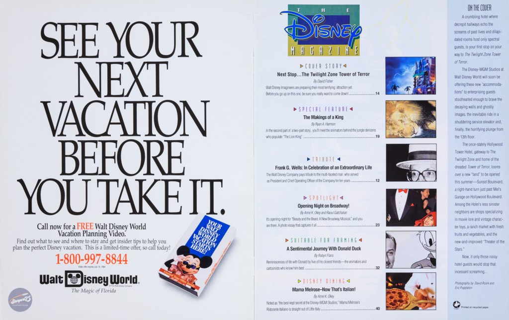 I subscribed to the Disney Magazine from Fall of 1990 through the last edition in Summer 2005, so I have a bunch of these that I want to digitally archive and share with you. Reading these magazines in the days before the internet was the main way to keep up on what was happening at Disney. So I devoured every page of every copy I received. This issue was no exception. With The Tower of Terror just celebrating its 25th birthday on July 22nd, I figured this was a good issue to start with.