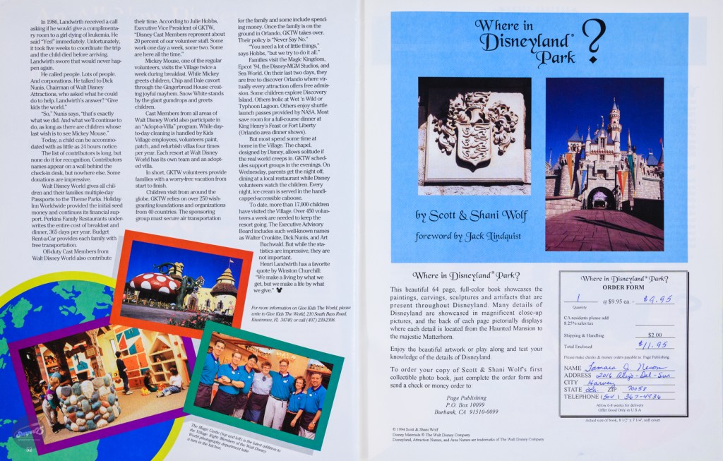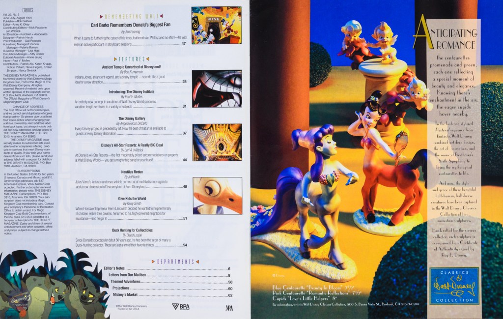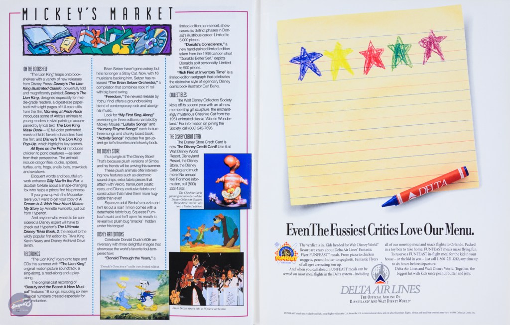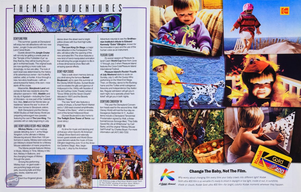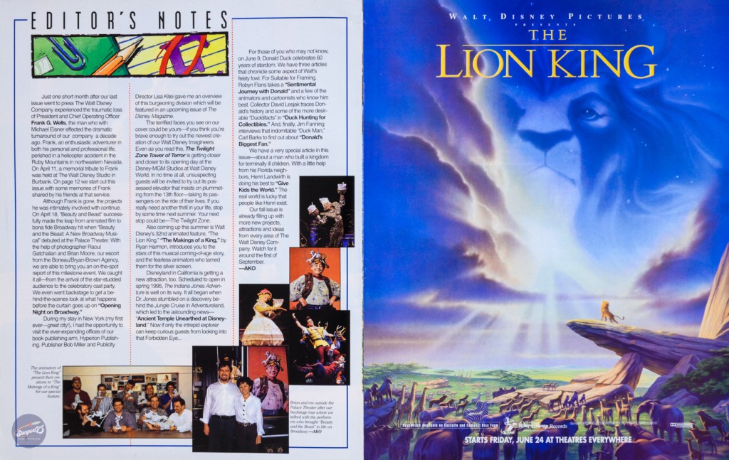 The Lion King was just about to premier in theaters, and Beauty and the Beast had just started on Broadway. The All-Star Resorts opened at WDW. The Indiana Jones Adventure was just about to open and would be covered in a future issue. Ahh…the mid-90s. Probably the absolute high-point of the Eisner tenure.